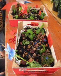 Ein mit starker Folie ausgeschlagenes, bunt bemaltes Obstkistchen wird mit Erde gefüllt und mit selbstgezogenen Küchen-Kräutern bepflanzt. Dann kommen die kleinen Landschaftsgärtner dran. Mit Holzstäbchen, Alufolie, Dekoteilen und eingefärbtem Sand sowie anderen Zutaten bauen wir eine wunderschöne Gartenanlage.